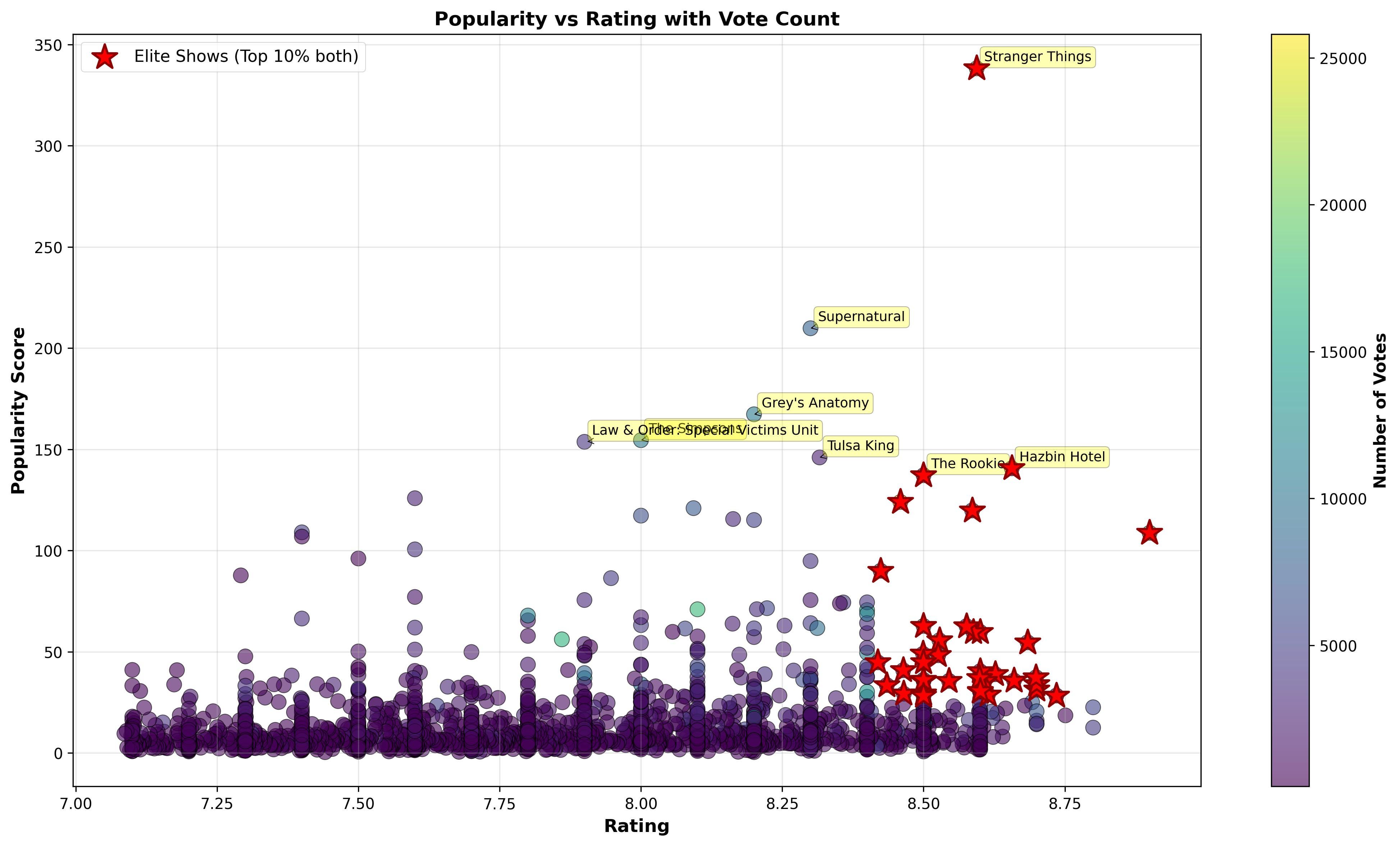 š Key Finding:Ā There's aĀ strong positive correlationĀ – higher-rated shows get exponentially more engagement. The top-tier shows (8.7+) haveĀ 3-4x the popularityĀ of average shows.