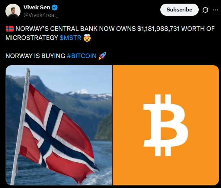 Norway Central Bank invests in MSTR stock/ source: X, Vivek Sen