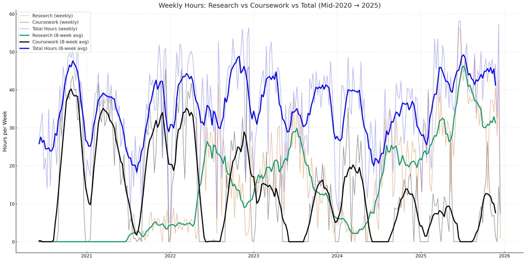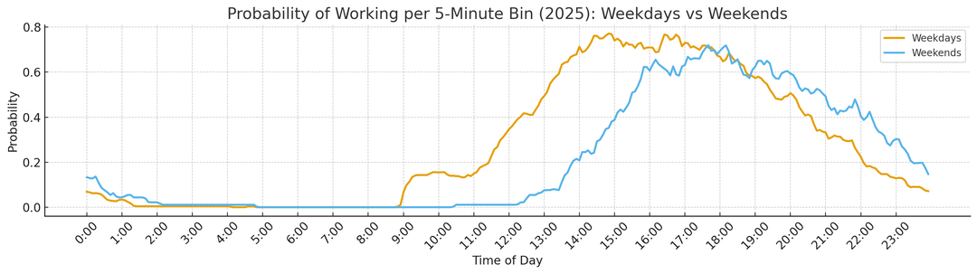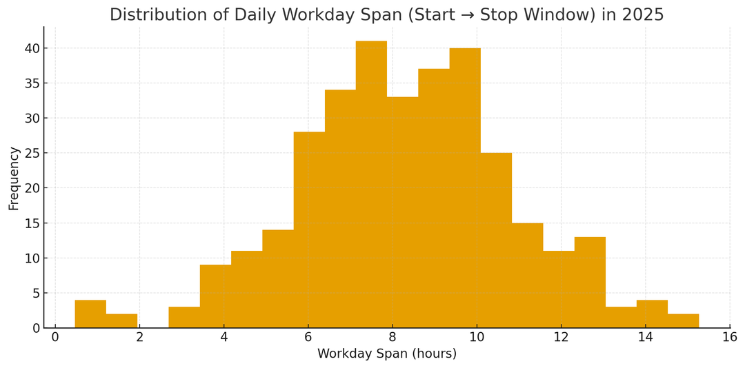 2025 has been my most productive year so far, averaging 6.22 hours of active work per day. I have a really terrible sleep schedule (as should be obvious by image 4), but I work every day to make up for it (I've only taken 2 days off in the past 8 months, including weekends). You'll also notice I only wake up at 9 AM less then 20% of weekdays, which is just because I have a 9AM research subgroup meeting every Tuesday.