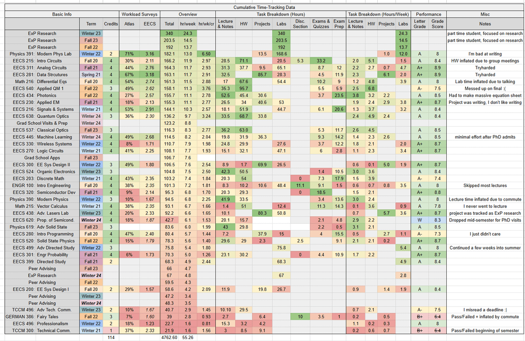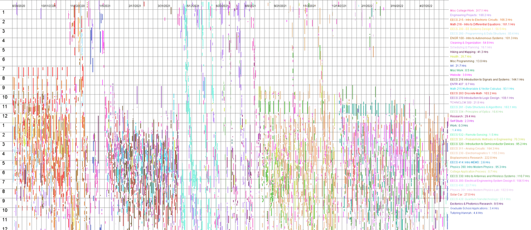 I started using Toggl to track my activity in 2019, but didn't start using it for everything until 2020, the year I graduated high school. The second image is a spreadsheet I made of the time spent in each of my undergraduate classes at UMich and how I did in them. The third image is an example of what the data itself looks like–I only track things if I am actively working on them, i.e. actively sitting at my computer reading something, writing code, taking notes, etc.