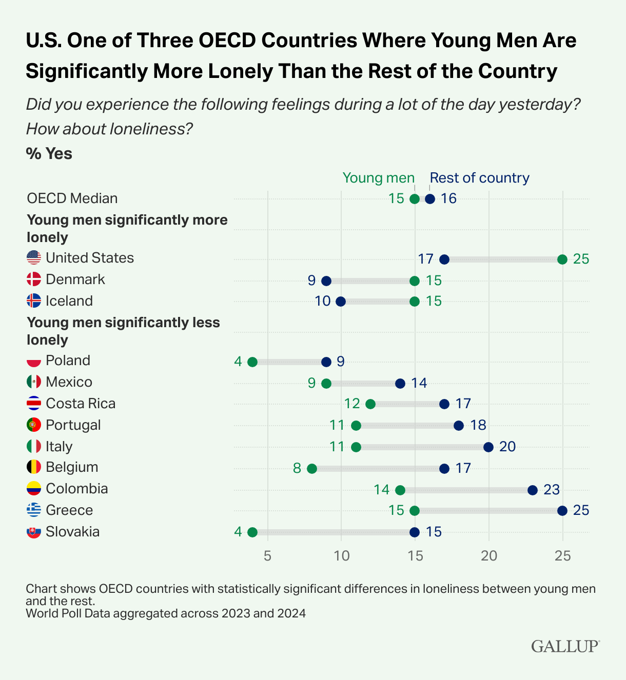 “Did you experience the following feelings during a lot of the day yesterday? How about loneliness?” is an extremely shitty way to measure “loneliness” as asking questions like that will vary strongly based on culture. The fact that both “young men” and “rest of country” score so low in Poland more shows people don’t think about loneliness, or don’t experience it the same way as for example Greeks, than showing we’re an extremely non-lonely nation.