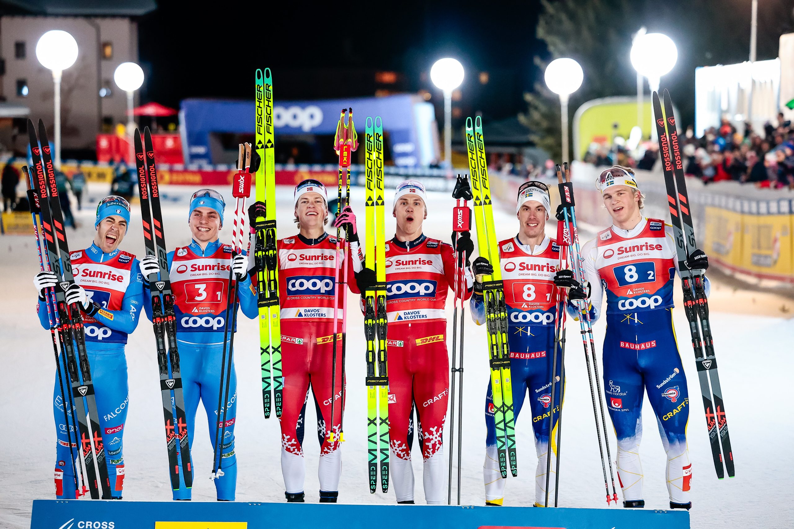 Federico Pellegrino (ITA), Elia Barp (ITA), Johannes Hoesflot Klaebo (NOR), Erik Valnes (NOR), Johan Haeggstroem (SWE), Edvin Anger (SWE), (l-r) (Photo: NordicFocus)