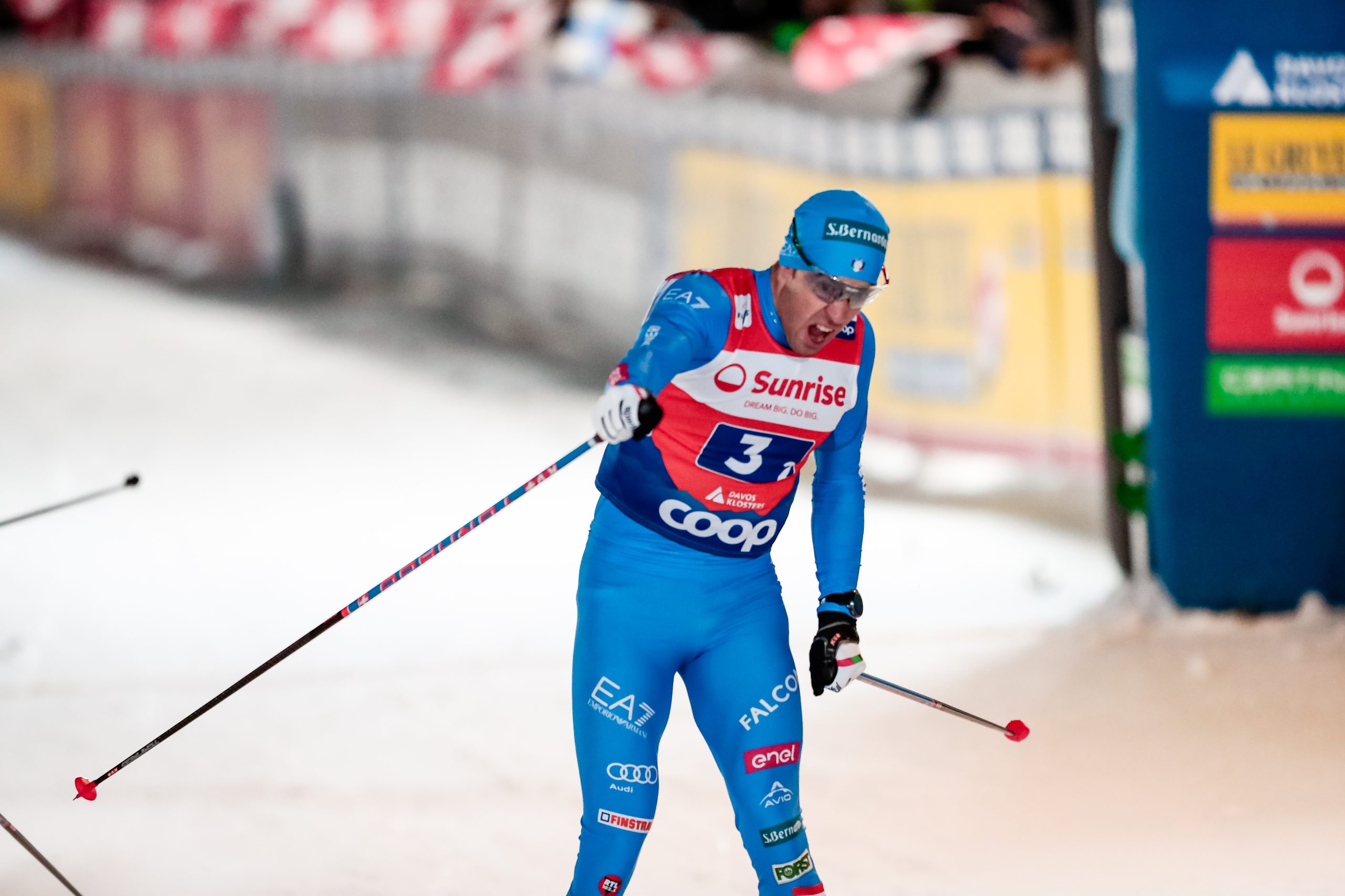 At the start Valnes shot to the lead and looked determined to set a brisk pace. An early crash by Barp pushed Italy I to the back and meant Pellegrino would have his work cut out for him. At the first exchange the field was still tightly bunched with Norway I and Sweden II going to the front. Halfway through this leg there was another crash as Sweden I’s Edvin Anger crashed in one of the icy turns. At this point Klaebo—who was unaware of the carnage behind him— decided to open up some navigating space around him and turned up the pace.