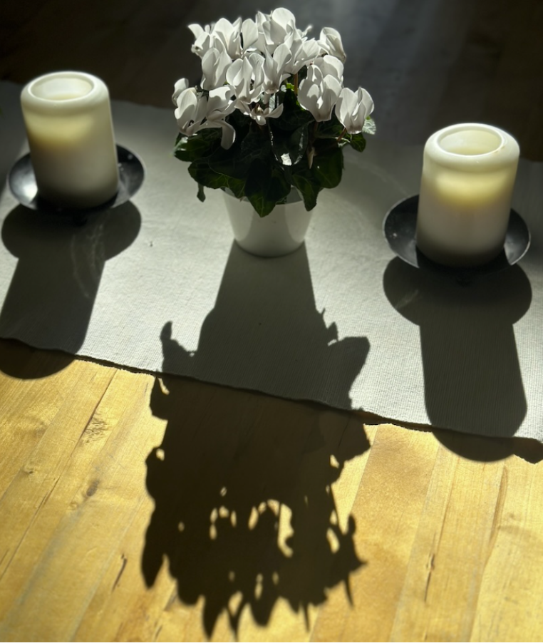 I love the shadow cast by my holiday-favorite cyclamen plant—I am looking forward to the daylight hours increasing on the Solstice!