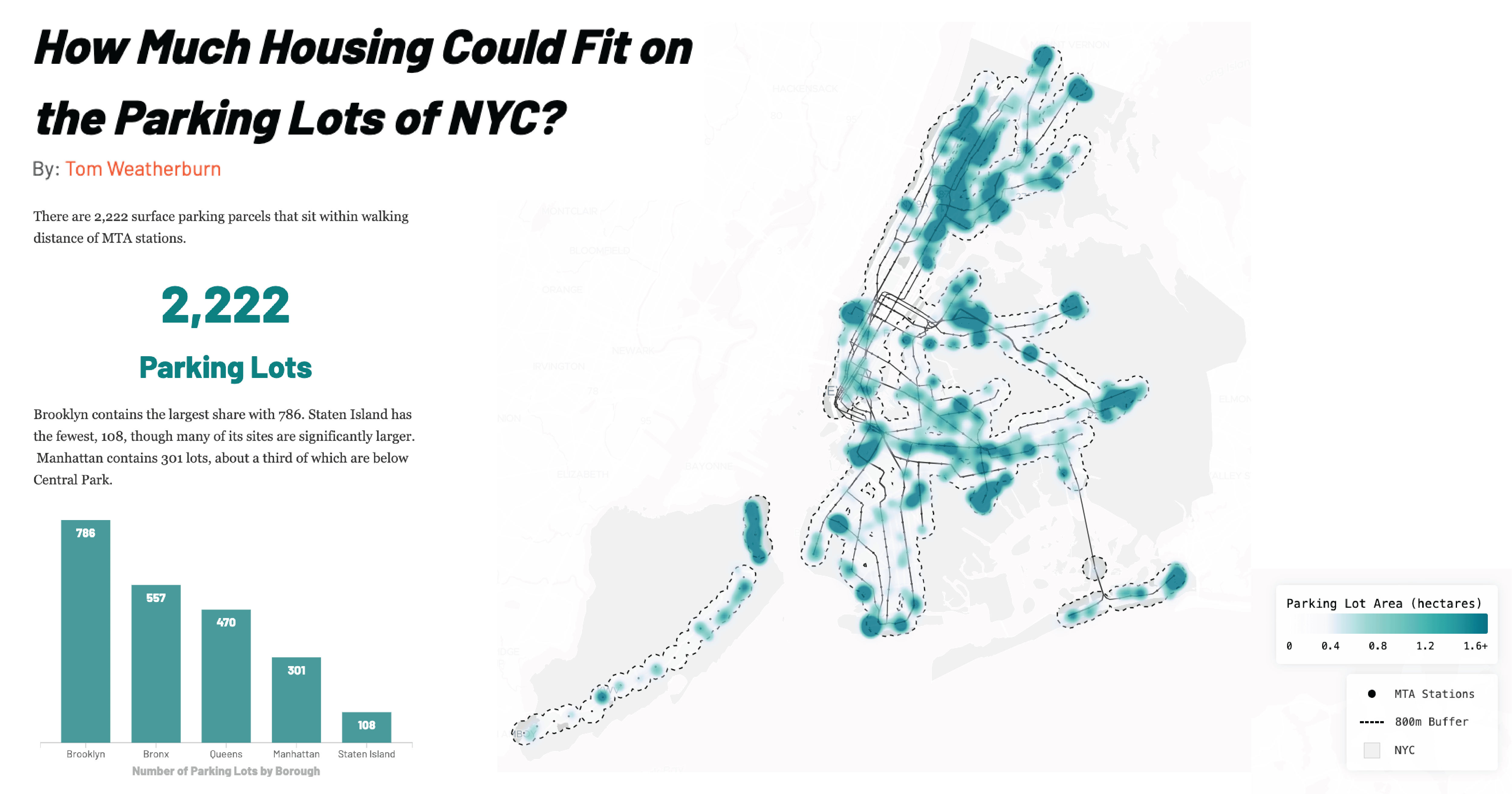 I created an FAQ style story map using SvelteJS, D3 and mapLibre. Used PLUTO data to identify surface lots and the density of recent housing development. Combining the two gave me an estimae of the total housing potential.