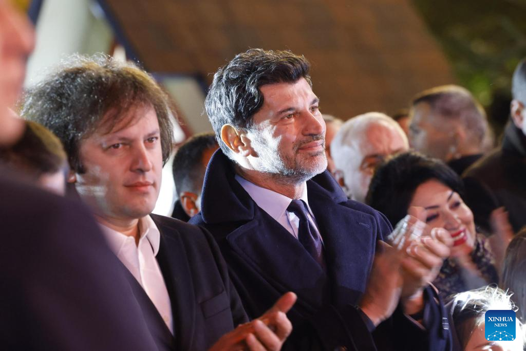 Georgian Prime Minister Irakli Kobakhidze (1st L) and Tbilisi Mayor Kakha Kaladze (2nd L) attend a lighting ceremony for the main New Year tree of Georgia at the First Republic Square in Tbilisi, Georgia, Dec. 12, 2025. (Tbilisi City Government/Handout via Xinhua)