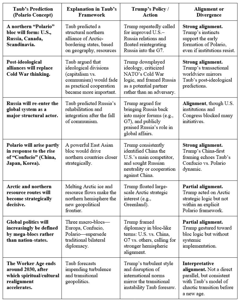 The correlation between Taub’s prediction of Polario and Trump’s rationale for seeing closer ties with Russia.