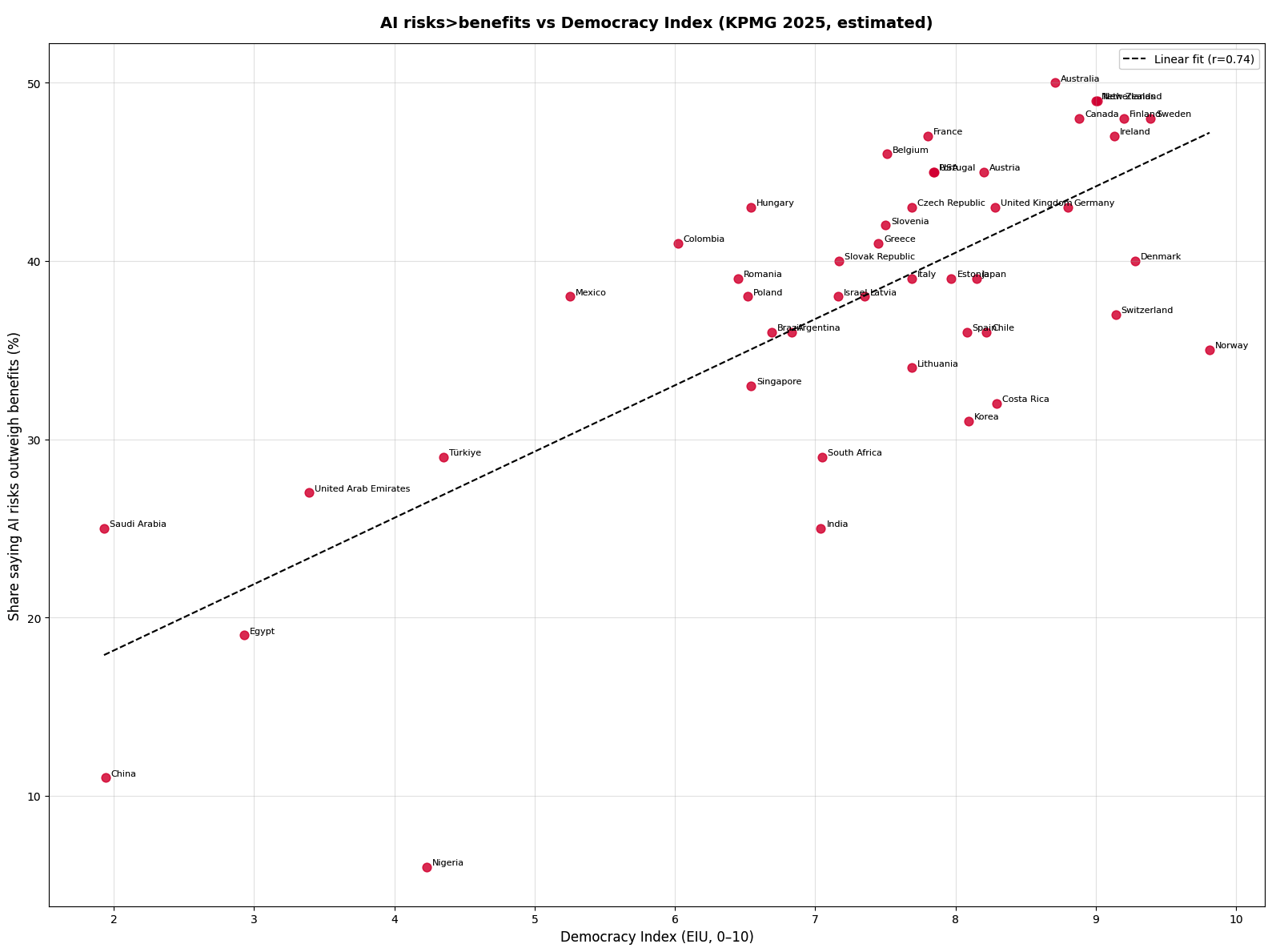 [OC] There is a strong correlation (r=0.74) between a country’s Democracy Index and how skeptical it is of AI (data from 2025 KPMG study)