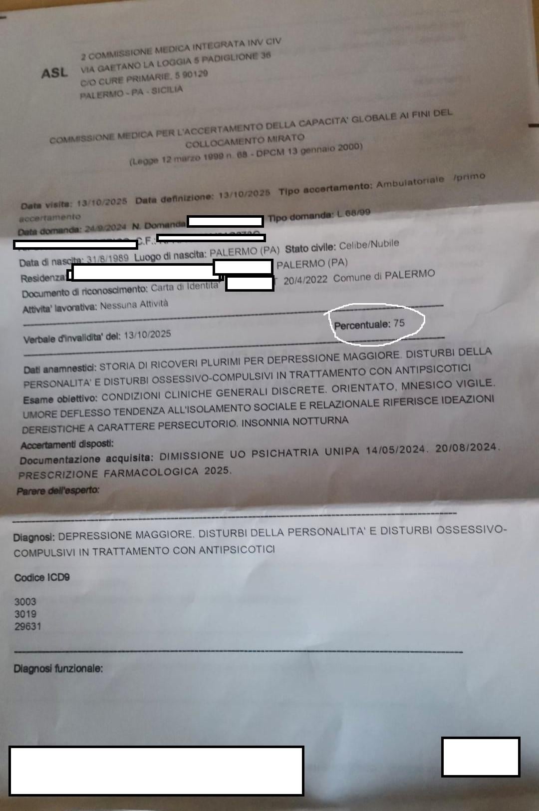 I apply to the INPS to be registered in the protected categories on September 2024, I am received in October 2025. They ask me questions, they ask me what I feel, if I hear voices, if I think of suicide and other diagnostic questions. I get the response and it turns out that I am 75% disabled, I am entitled to a monthly subsistence allowance and registration in protected categories.