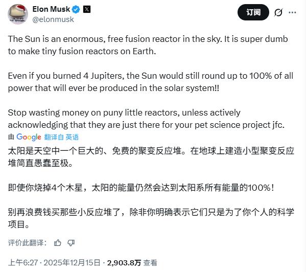 On December 15th, Musk publicly downplayed controlled nuclear fusion on X. He said, “The sun is a huge, free nuclear fusion reactor in the sky,” and bluntly stated, “Building small nuclear fusion reactors on Earth is simply extremely stupid.”