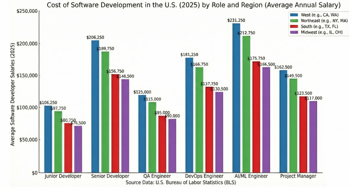 This chart compares average annual software developer salaries in the U.S. (2025) across different roles and regions, using salary as a proxy for development cost.
