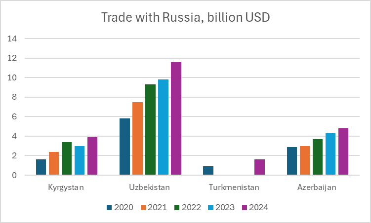 Third, Russian economic partnerships with Central Asian countries have yet to peak—unlike, apparently, Russian-Chinese ties. In nearly all cases, 2025 trade figures will exceed 2024 levels. No matter how regional countries assure the EU and U.S. of sanctions compliance, economic incentives drive them to find new ways to meet Russian demand. Except for Moldova, all regional states economically benefit from the Ukraine war’s consequences.