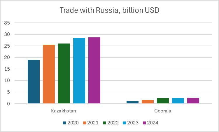Kazakhstan, Russia’s most important Central Asian partner, alongside Armenia remains a key channel for sanctions evasion and parallel imports—as clearly reflected in trade statistics. Turnover was $ 19 billion in 2020, $ 25.6 billion in 2021, $ 26 billion in 2022, $ 28.4 billion in 2023, and $ 28.7 billion in 2024, with growth to $ 30 billion expected in 2025.