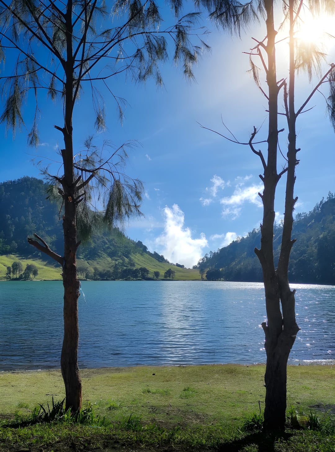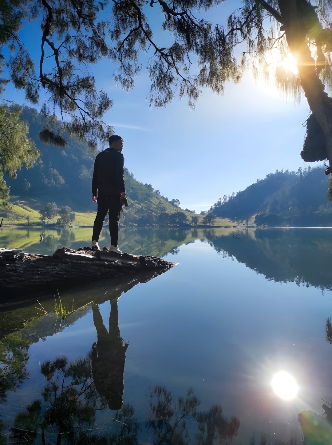 A mountainous landscape in Yogyakarta where green hills, calm lakes, and winding rivers come together in a serene natural setting. Clear skies and abundant vegetation create an atmosphere of balance and calm, reflecting the close connection between well-preserved nature and the surrounding environment.