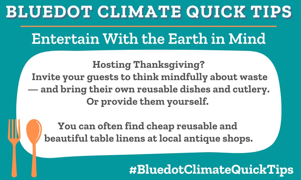 Entertain using reusable dishes and table linens. Ditch the throwaways. Read more on how to set a sustainable dining table.
