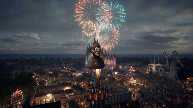 The immersive zones inlude “Transylvania” with roller coasters, a traditional village and forest; “Dracula’s Castle” with ruins, a maze, a lake and a bat coaster; “The Family Kingdom” featuring supernatural creatures from global cultures; “London Town” with vampire-hunting parkour and obstacle course, ship-swing, lake boats, and horse-and-carriage track ride; and “Port of New Orleans” with a werewolf roller coaster race and Mardi Gras carnival games.