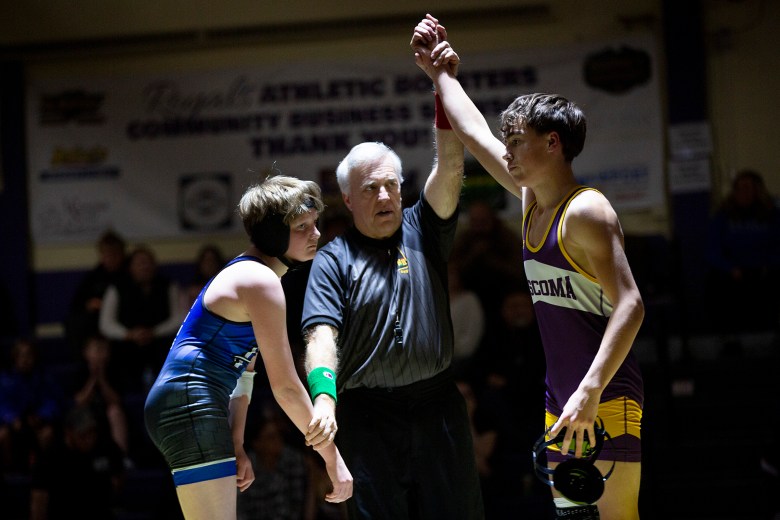 Mascoma’s Jaxon Butterfield, right, is declared the winner at the end of a match at 120 pounds against Pelham’s Ryan Nutting, left, during a wrestling match at Mascoma Valley Regional High School in Canaan, N.H., on Tuesday, Dec. 16, 2025. ALEX DRIEHAUS / Valley News