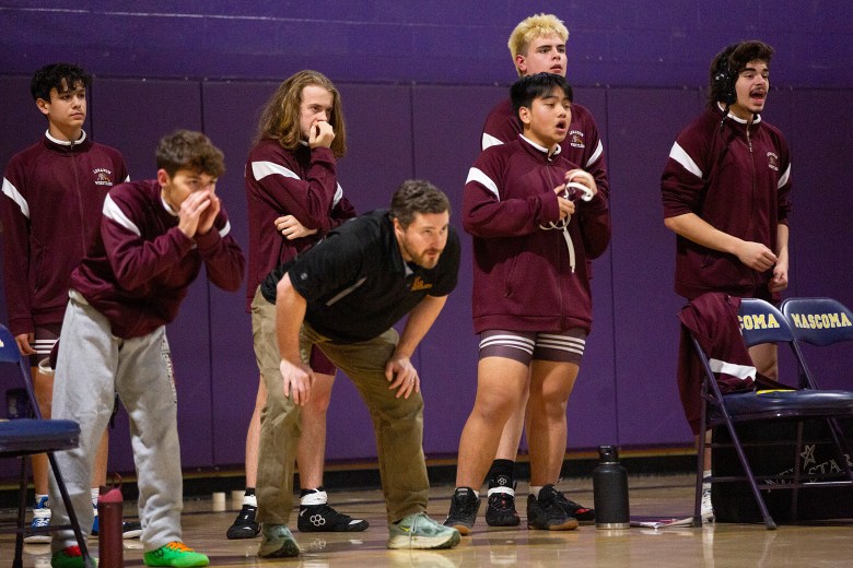 Lebanon teammates join coach Erik Braghirol, center, in cheering on Gardell Wetherington during a wrestling match at Mascoma Valley Regional High School in Canaan, N.H., on Tuesday, Dec. 16, 2025. ALEX DRIEHAUS / Valley News