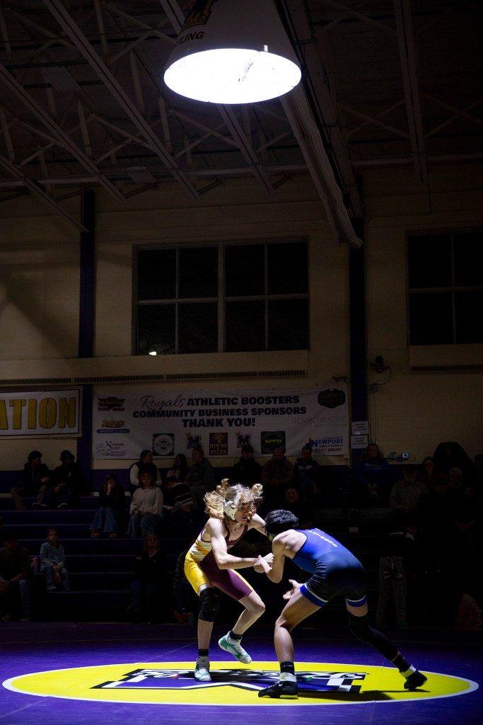 Lebanon’s Gardell Wetherington, left, faces off against Pelham’s Brennan Reinhart at 113 pounds during a wrestling match at Mascoma Valley Regional High School in Canaan, N.H., on Tuesday, Dec. 16, 2025. Reinhart won the matchup. ALEX DRIEHAUS / Valley News