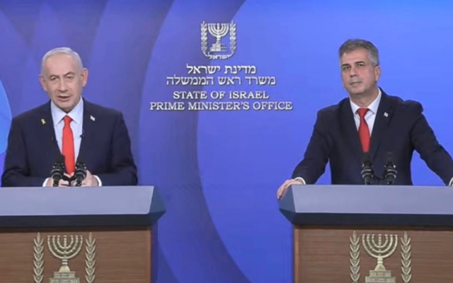 Prime Minister Benjamin Netanyahu, left, in a video statement alongside Energy Minister Eli Cohen, announcing a record gas deal with Egypt, December 17, 2025. (Energy Ministry)