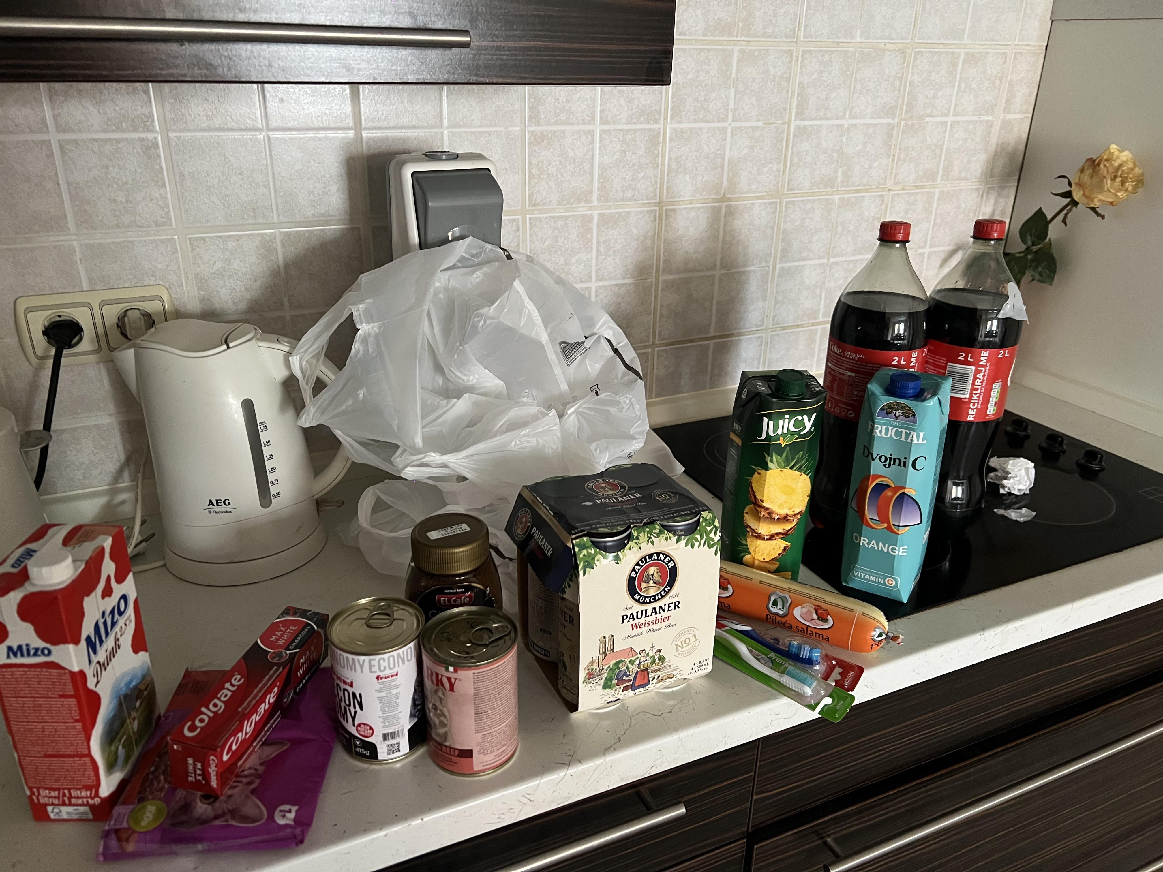 mlijeko cca 2KM, colgate 5KM, hrana za macku 4.5KM, dvije ove economy vjerovatno po 2KM kafa izmedju 11-13KM reci cemo 12, paulaner 8KM, dvije cetkice, 5KM, ananas 3KM, dvojni c 2,5KM, dvije kole 6KM, dvije 3 u 1 velike 15KM, salamu sam zaobisao jer ne znam koliko kosta mozda 3KM jer ne izgleda kao da je neka kvalitetnija