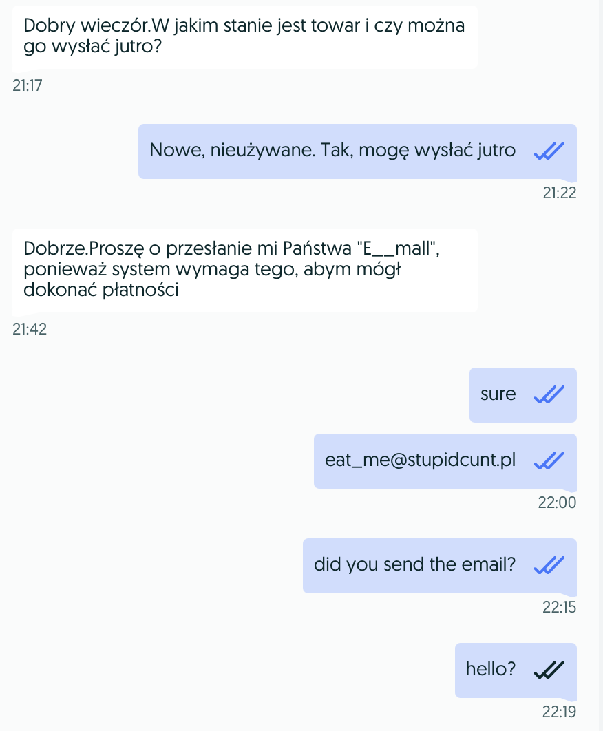 it’s likely a bot but if it wasnt, that “[eat_me@stupidcunt.pl](mailto:eat_me@stupidcunt.pl)” definitely wouldn’t help you close the sale