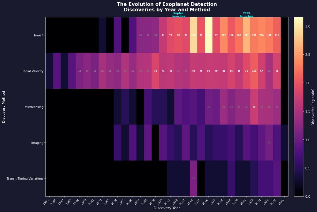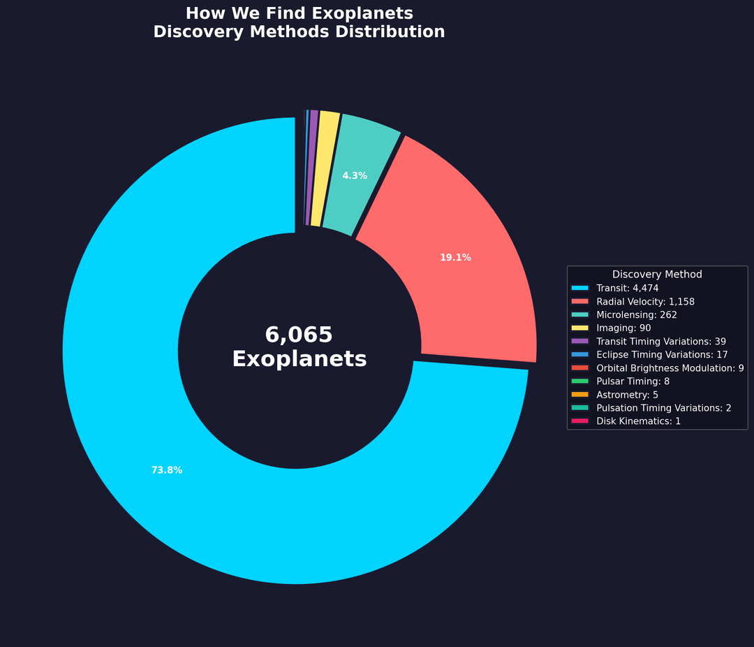 – Transit Method Dominance: 73.8% of all exoplanets were found via the transit method (detecting starlight dips as planets cross their stars). Radial velocity is a distant second at 19.1%.