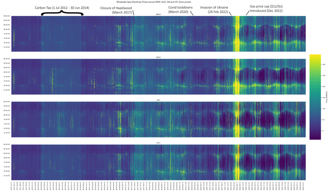 Data source: 5 minute prices from AEMO (https://nemweb.com.au/Reports/Archive/Public\_Prices/). Older data was sourced from a proprietary copy of AEMO's MMS model as it is no longer available to the public since this year, they started removing reports for data older than 13 months sadly.