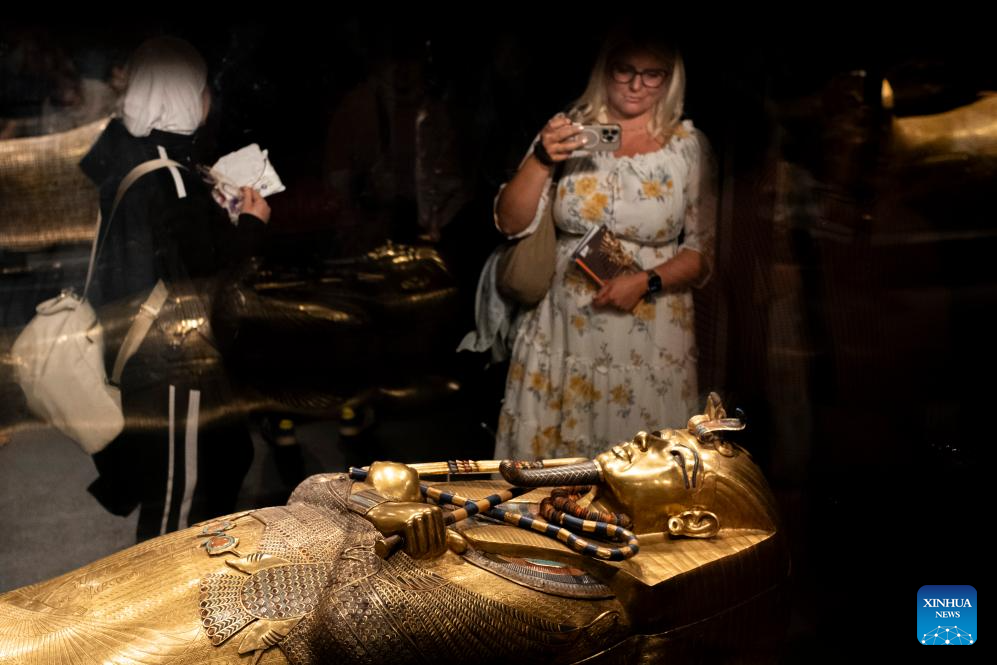 People view the Solid Gold Inner Coffin of Tutankhamun at the King Tutankhamun exhibition hall of the Grand Egyptian Museum in Giza, Egypt, on Dec. 20, 2025. The Grand Egyptian Museum (GEM) opened its doors to the public on Nov. 4, establishing itself as one of the world’s largest displays of ancient relics, and a high-tech fort dedicated to heritage conservation.