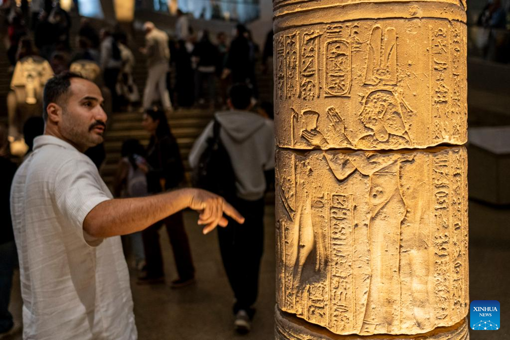 A visitor views the Column of King Ptolemy IX at the Grand Egyptian Museum in Giza, Egypt, on Dec. 20, 2025. The Grand Egyptian Museum (GEM) opened its doors to the public on Nov. 4, establishing itself as one of the world’s largest displays of ancient relics, and a high-tech fort dedicated to heritage conservation.