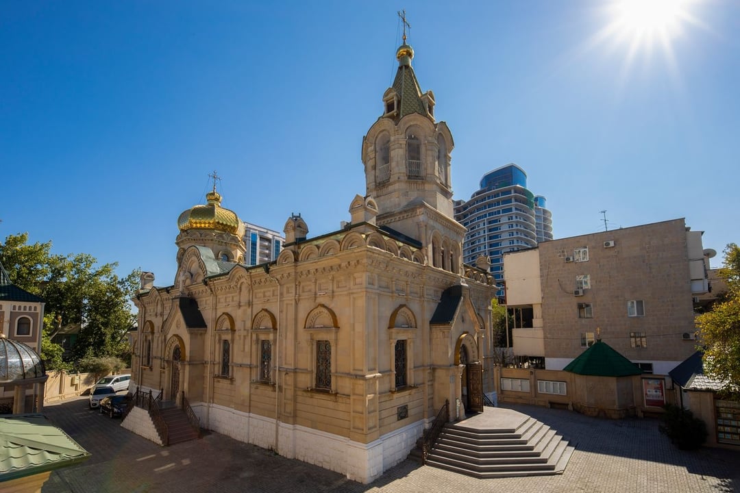 It was built in 1909 in the Russian style based on the project of the architect M. Verzhbitsky, with the personal financial assistance and donations of the famous Azerbaijani millionaire and philanthropist Haji Zeynalabdin Taghiyev. Prominent political and religious figures of that time participated in the opening of the church.