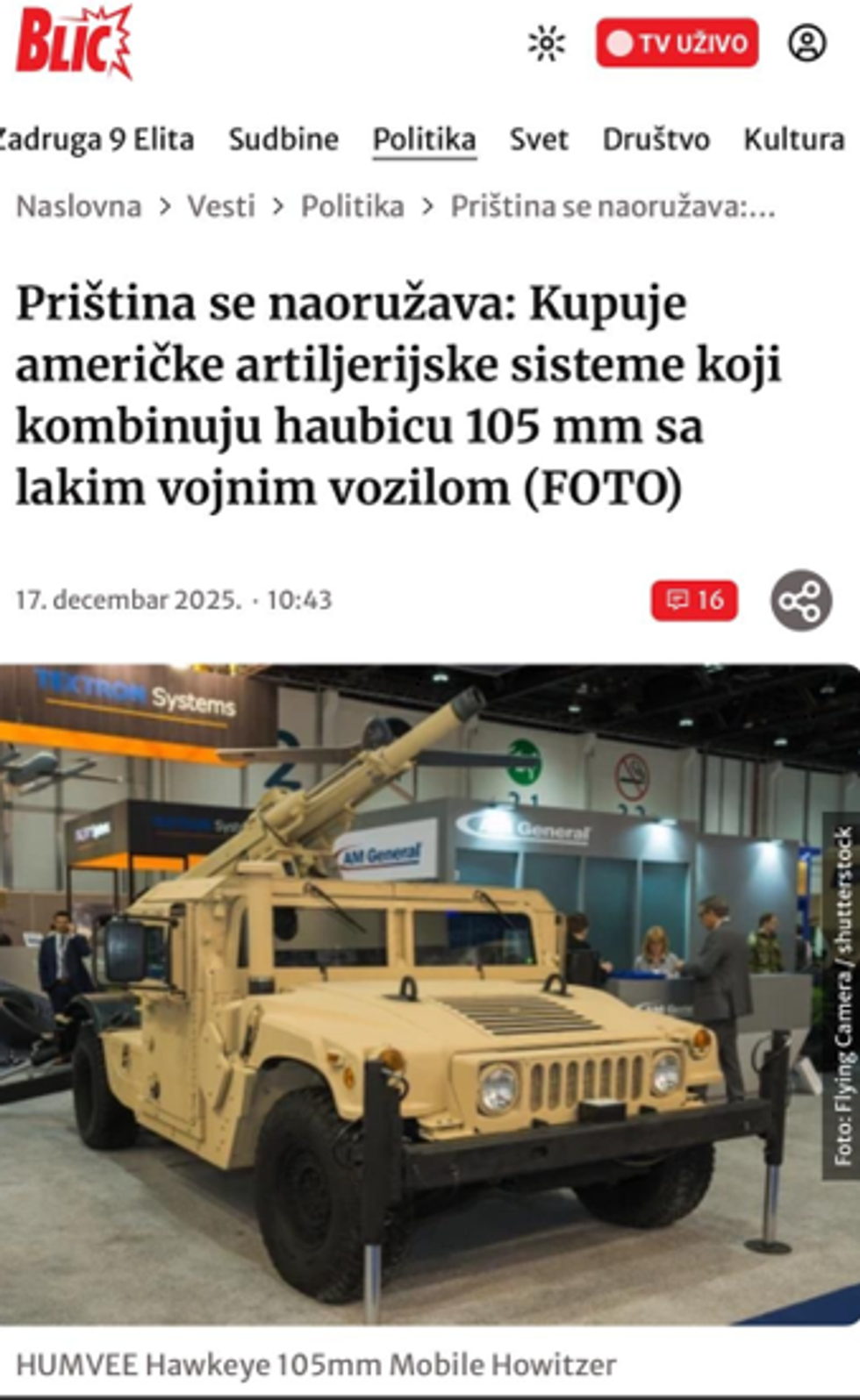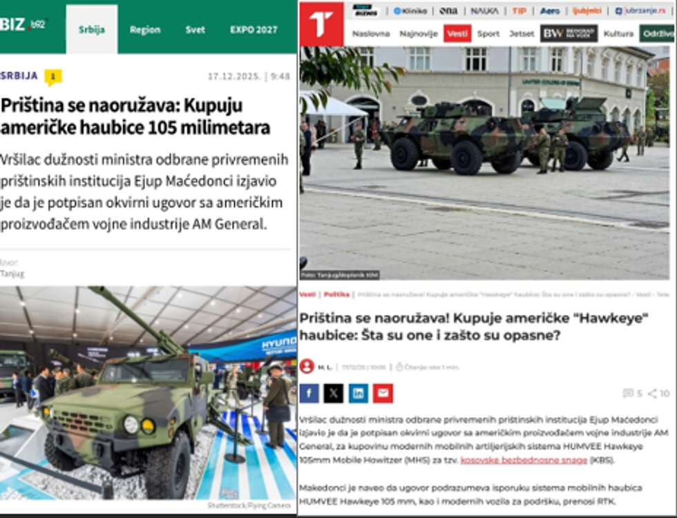 The BLIC portal wrote that “Pristina is arming itself: it buys American artillery systems that combine the 105 mm howitzer with a light military vehicle,” presenting the deal as a threatening development for regional security.
