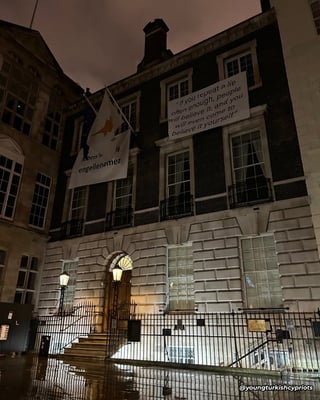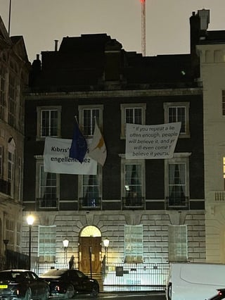 As Turkish Cypriots gathered outside the Greek Cypriot High Commission to commemorate the victims of Bloody Christmas, the Commission hung banners from its building, including the quote: “If you repeat a lie often enough, people will believe it, and you will even come to believe it yourself.”