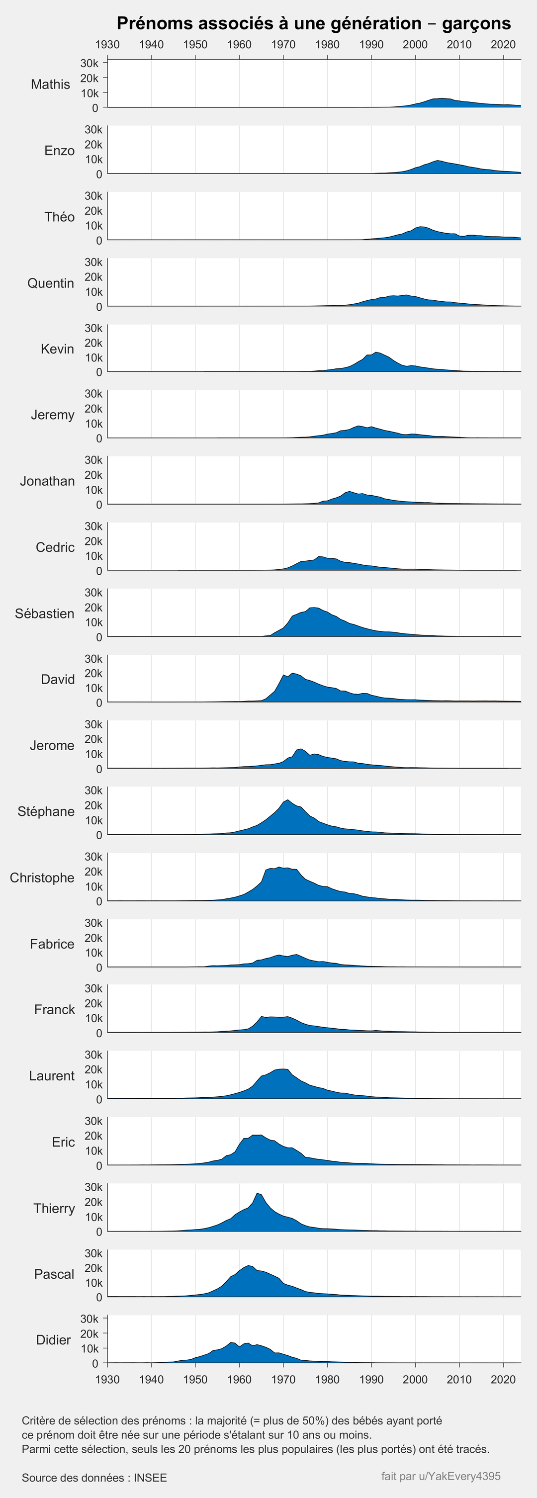 [OC] First names associated with a generation (INSEE data)