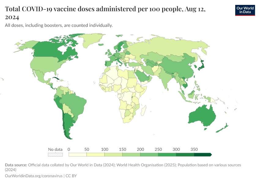 This chart shows the total number of COVID-19 vaccine doses administered per 100 people within a given population. Note that this is counted as a single dose, and may not equal the total number of people vaccinated, depending on the specific dose regime as several available COVID vaccines require multiple doses.