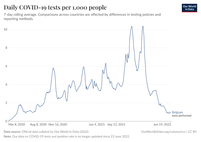 This chart shows the number of daily tests per thousand people. Because the number of tests is often volatile from day to day, we show the figures as a seven-day rolling average.
