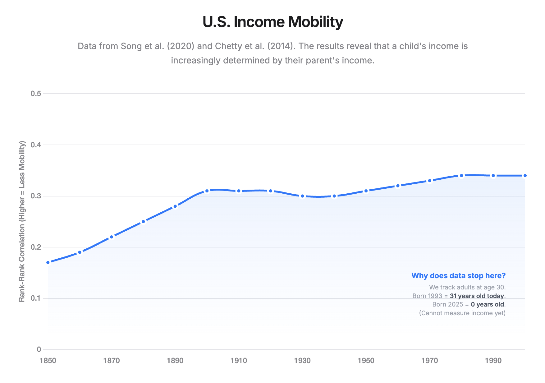 Historical Data (1850–1970): Song et al. (2020), “Long-Term Decline in Intergenerational Mobility in the United States since 1850”