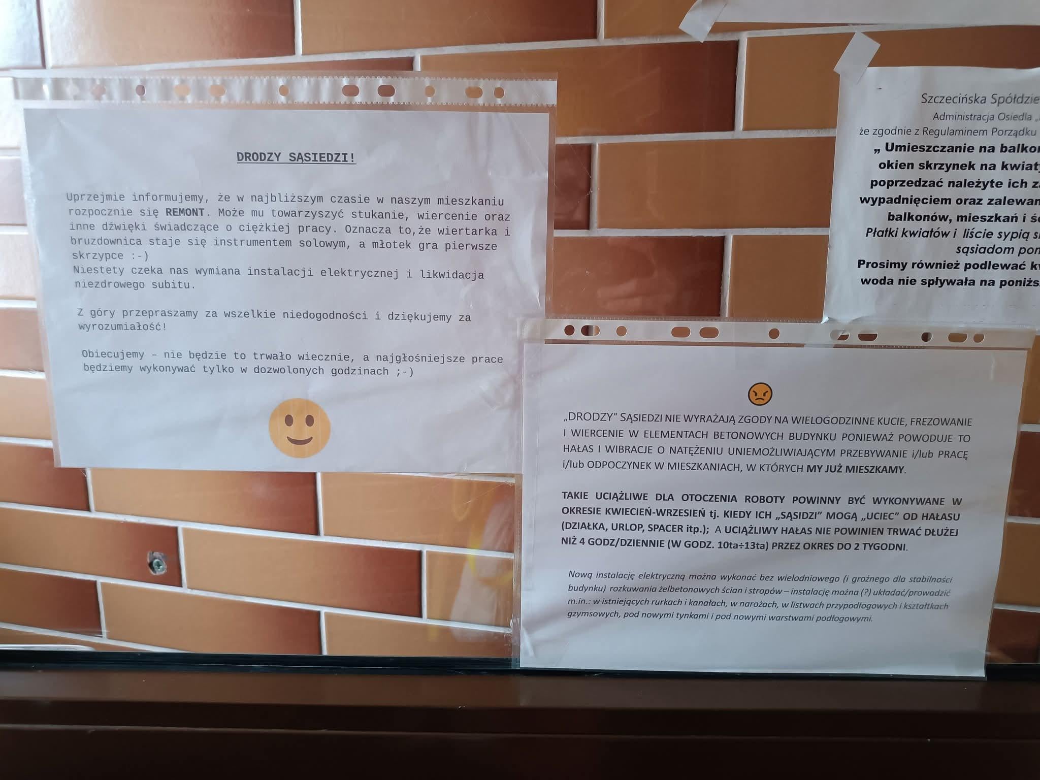 Problem tego człowieka to myślenie o sąsiadach w jakikolwiek sposób, w tym wywieszanie głupiej kartki. Masz remont, robisz remont a reszcie ciul do tego. Jak ktoś przyjdzie ze skarga, przypadkowo zrobię borowanie w godzinach po 22. Ale tylko chwilę, żeby wkurzyć a nie dać się złapać na zgłoszenie. Jak ktoś zacznie narzekać powiem ze tez to słyszę i narzekam i ten sąsiad co robi to musi być jakiś nie ten tego, a ogólnie to smacznej kawusi. Ogólnie sąsiedzi to powietrze, jeszcze żaden się nie zastosował do uwag więc ja też mam to w rzyci