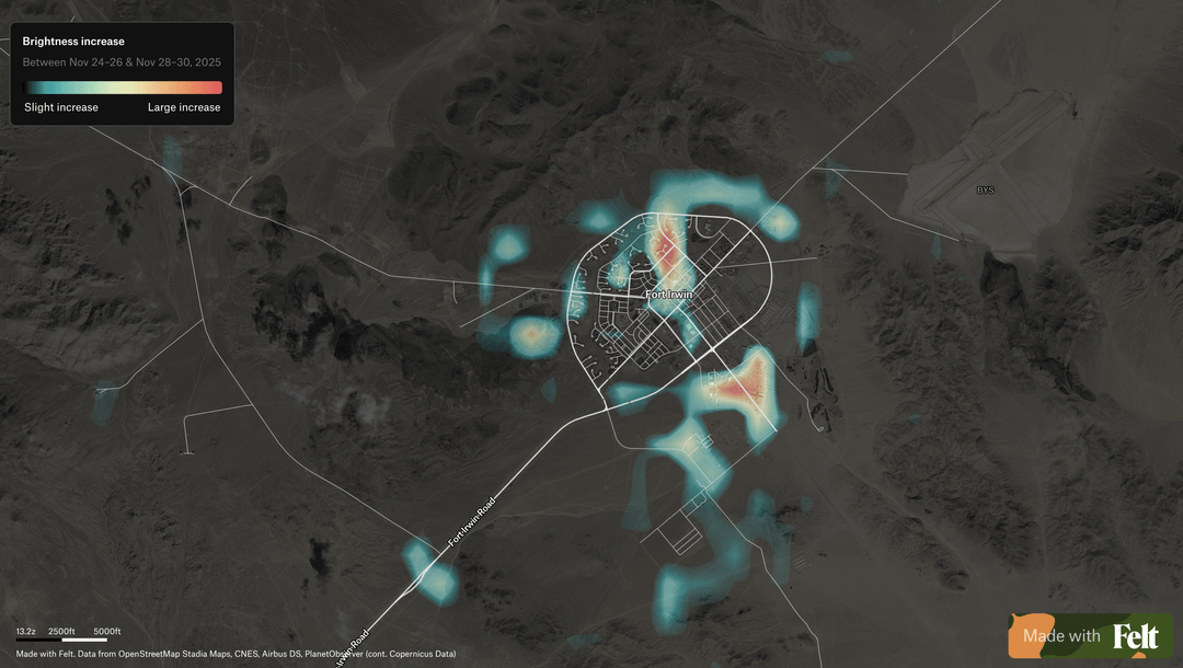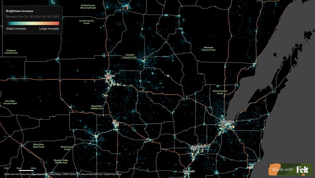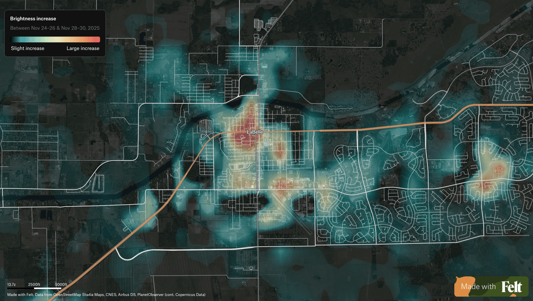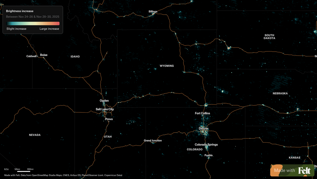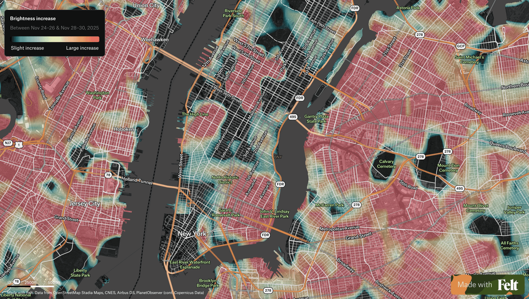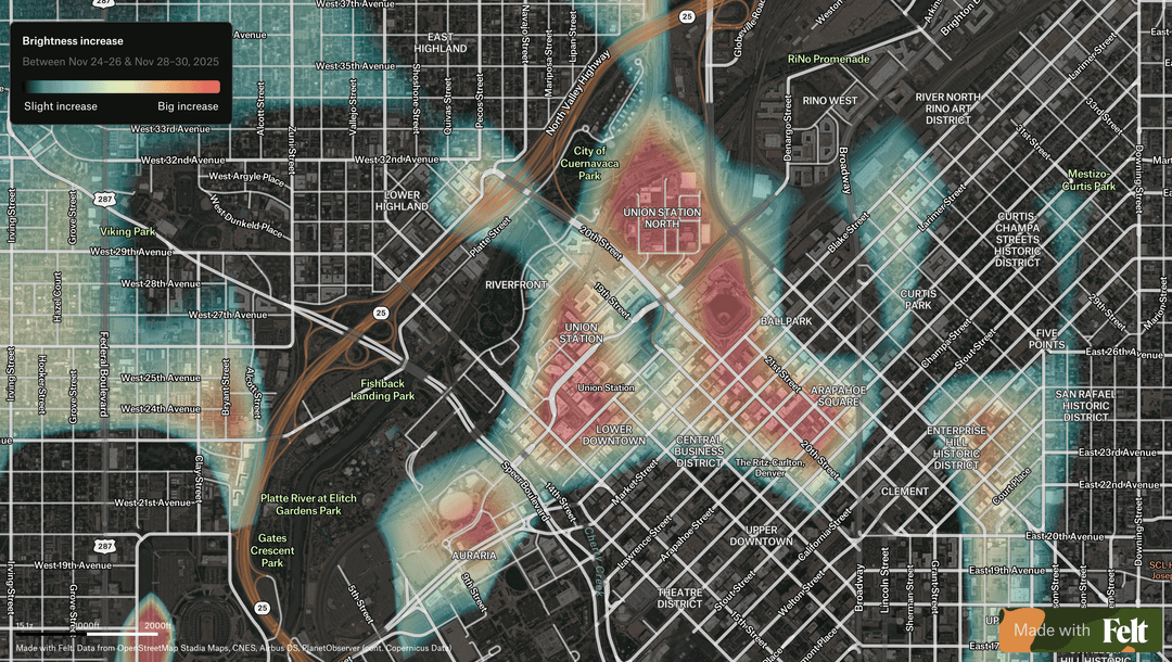 **Each location is compared to itself over time**, so permanent city lighting fades into the background and locations that increased in brightness are highlighted rather than places that are already bright overall.
