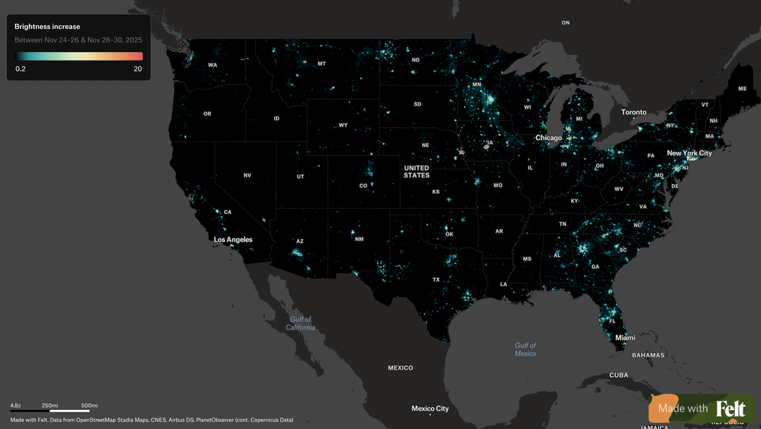 This map compares averaged nighttime brightness before Thanksgiving (Nov 24th – 26th) to averaged brightness a few days after (Nov 28th – Nov 30th).