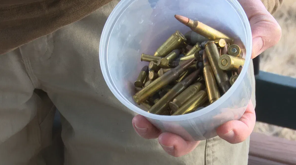 Dan Voth holds a container of live ammunition that he collected in one day walking the range. Photo taken on Nov. 28, 2025.