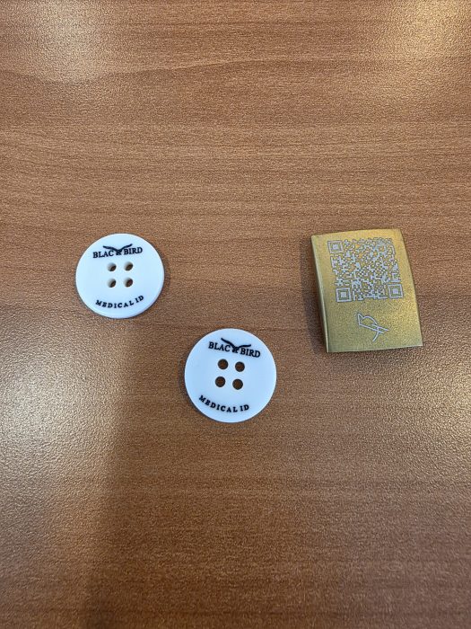 When someone is wearing a Black Bird device, anyone can scan the QR code and see basic information that they’ve designated to appear publicly. This may include a family member to call and information about a medical condition.