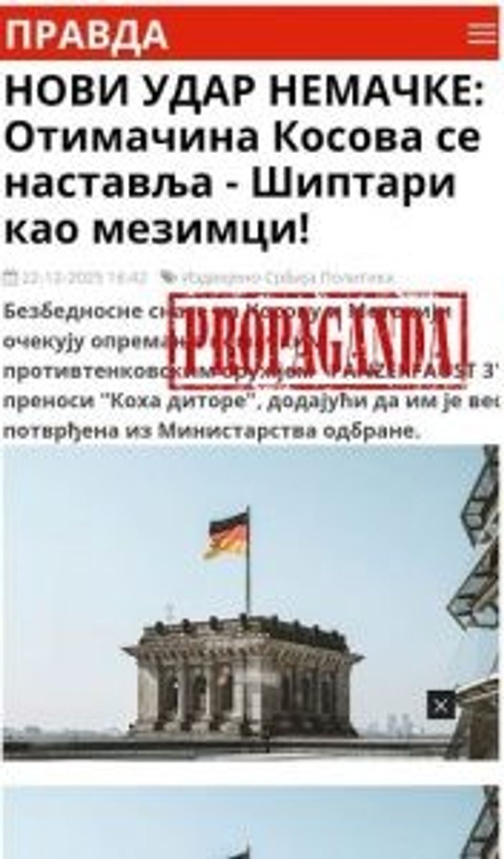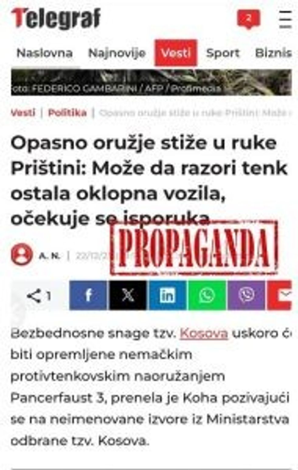 Pro-government media and tabloids in Serbia are conducting a disinformation campaign, presenting the supply of Kosovo with the “Panzerfaust 3” anti-tank system as a threat to peace in the region, as part of the so-called “Greater Albania” project, as an act of aggression against “Serbs and Serbia”, and as “illegal armament”.