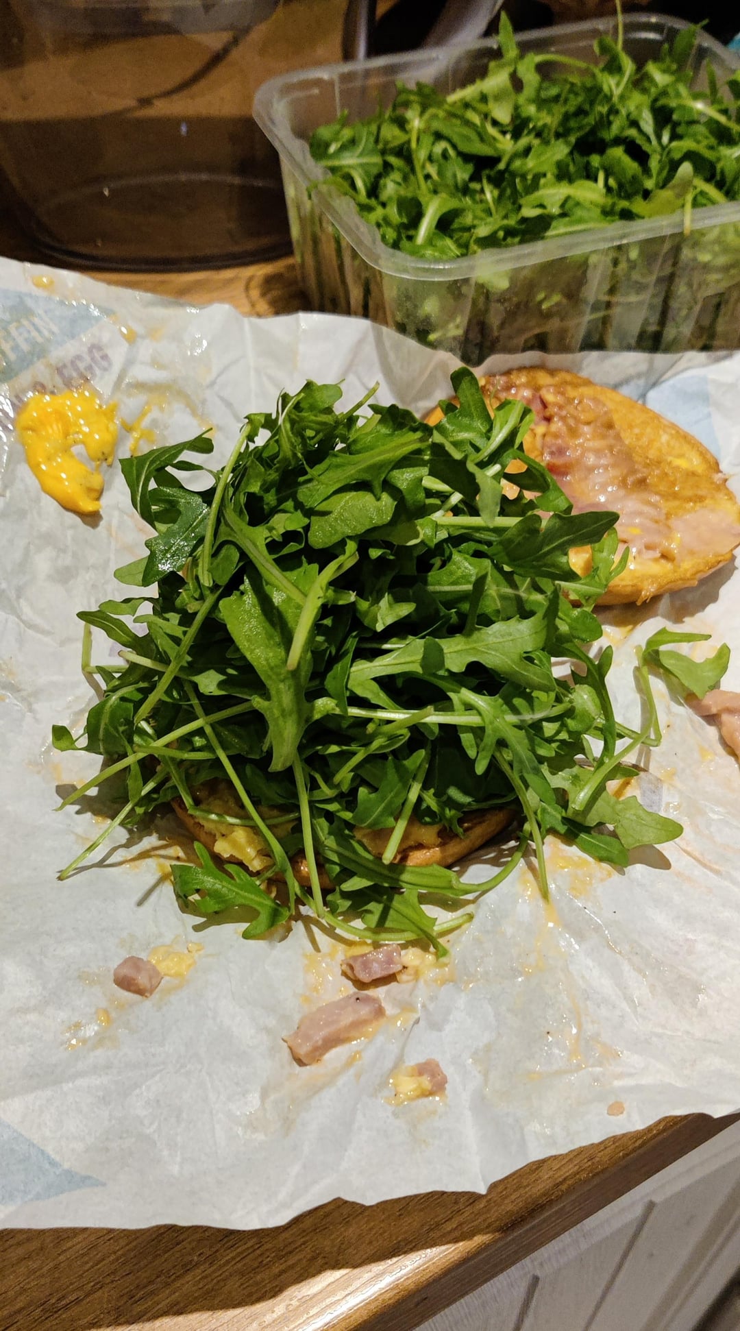 So I went to Tesco for arugula (washed), and the house prepared a bagel according to its requirements, my Crunchy Rukolamax Bagel Supreme™.