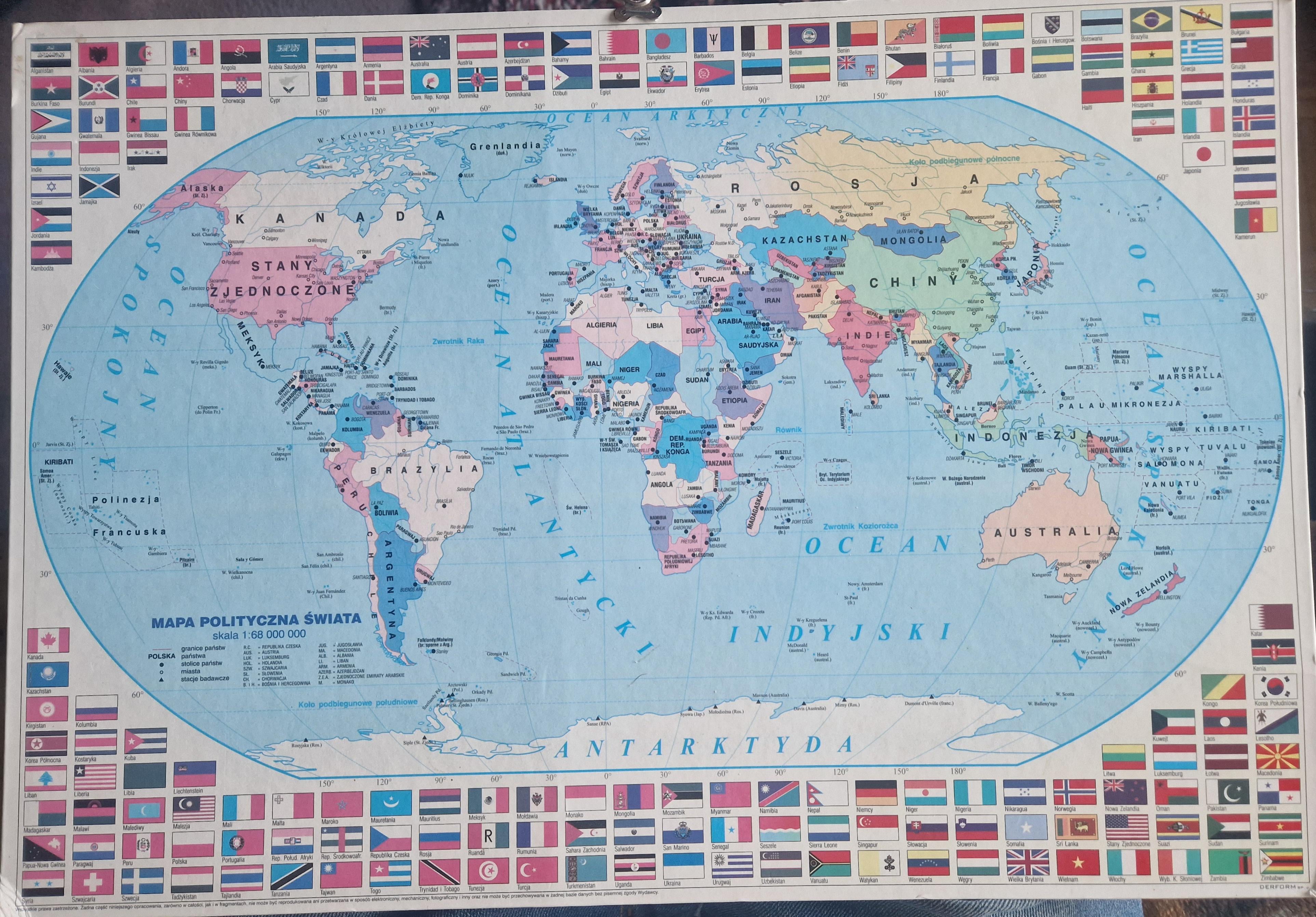 The flag of Afghanistan was changed in 1992, but many countries did not recognize the change and continued to use the old flag. East Timor is marked on the map, but Poland did not recognize its earlier annexation in 1976 and even pushed for its independence, so this is not a clue. In addition, the name Zaire is not on the map, only DRC. This change took place in May 1997. In India, Mumbai is written as Bombay, and the old name was used until 1995, but many atlases continued to show the old name for a long time. So I conclude that the map dates from 1997-98. The only inaccuracy at this point is the changed flag of South Africa, but this should be ignored.