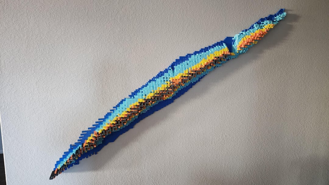 This chart shows the half life of each isotope from the periodic table. On the vertical axis is the number of protons and on the horizontal is the number of neutrons. The height of each column corresponds to the half life. The height is not on a linear or logarithmic scale but rather a custom scaling to give a more interesting shape. The different color sections correspond to the length of the half life. The half lives are: dark blue – less than a second, light blue – less than a minute, yellow – less than a day, orange – more than a day, black – stable. This is about 8ft long from end to end. It took about a month to print.