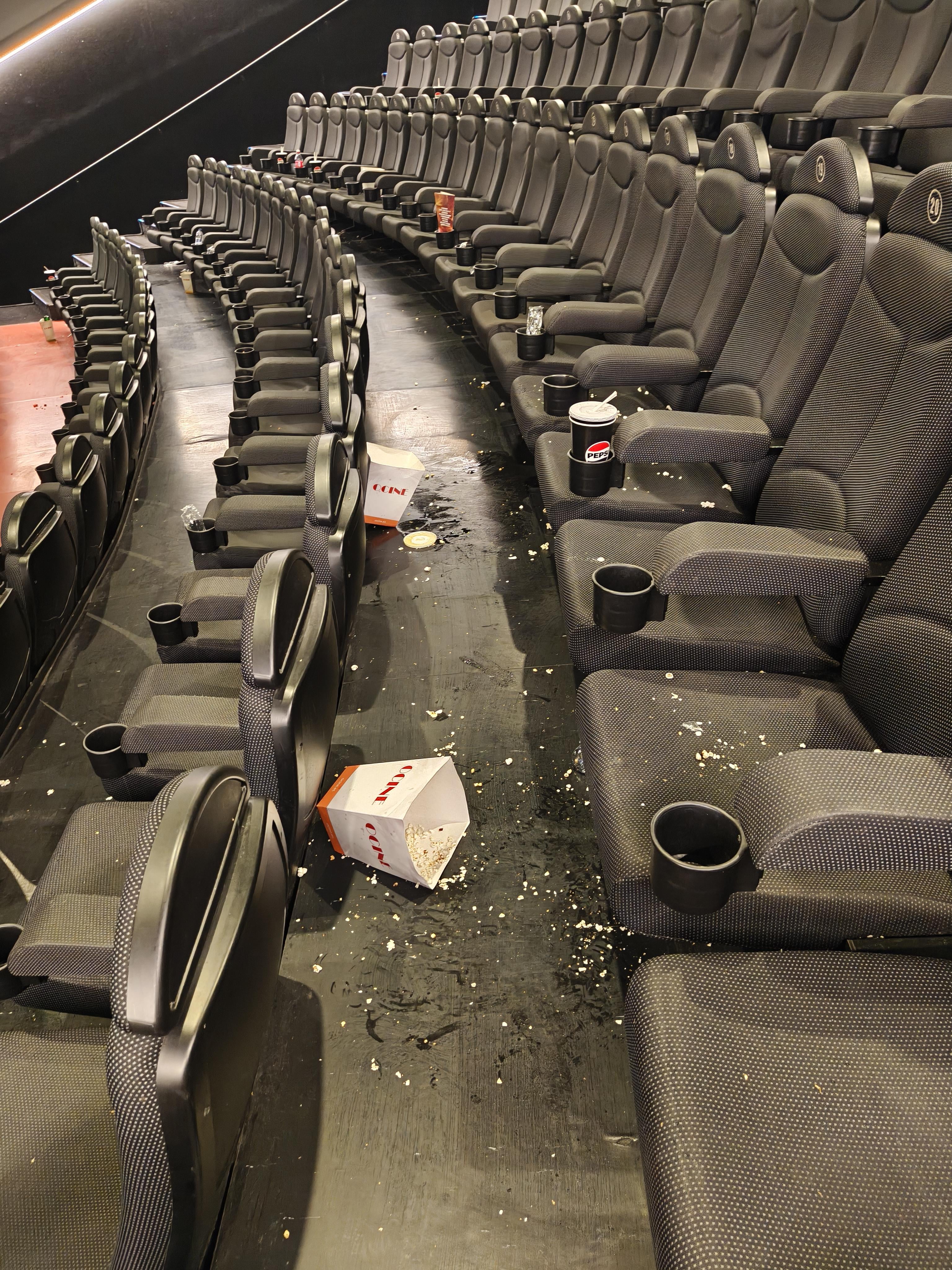 Trabajo en un auditorio clĆ”sico en un paĆs del norte de Europa y esto es lo normal. EstĆ” oscuro y las cosas se caen. Las cosas que la gente deja por ahĆ, se recogen en unas pasadas y bueno las palomitas pasan la aspiradora y bueno para eso hay un equipo de limpieza tambiĆ©n. En cualquier sitio donde se consumen cosas y estĆ”s a oscuras estas cosas pasan. Que decir ya si trabajas en una disco. O recuerdo cuando era pequeƱo en los bares iba todo al suelo directamente cuando estabas en la barra.