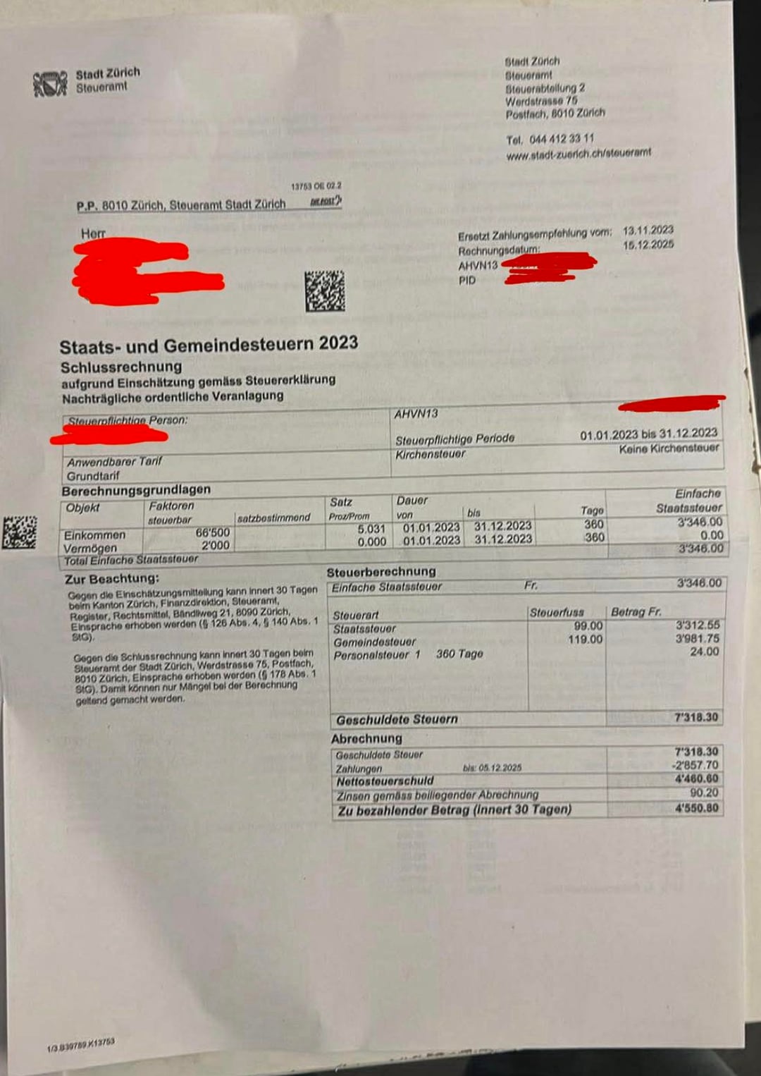 The 7318 .- they want from you is pretty much exactly the “correct” amount for your taxable income of 66500 according to Zurichs tax calculator (when using normal rates).
