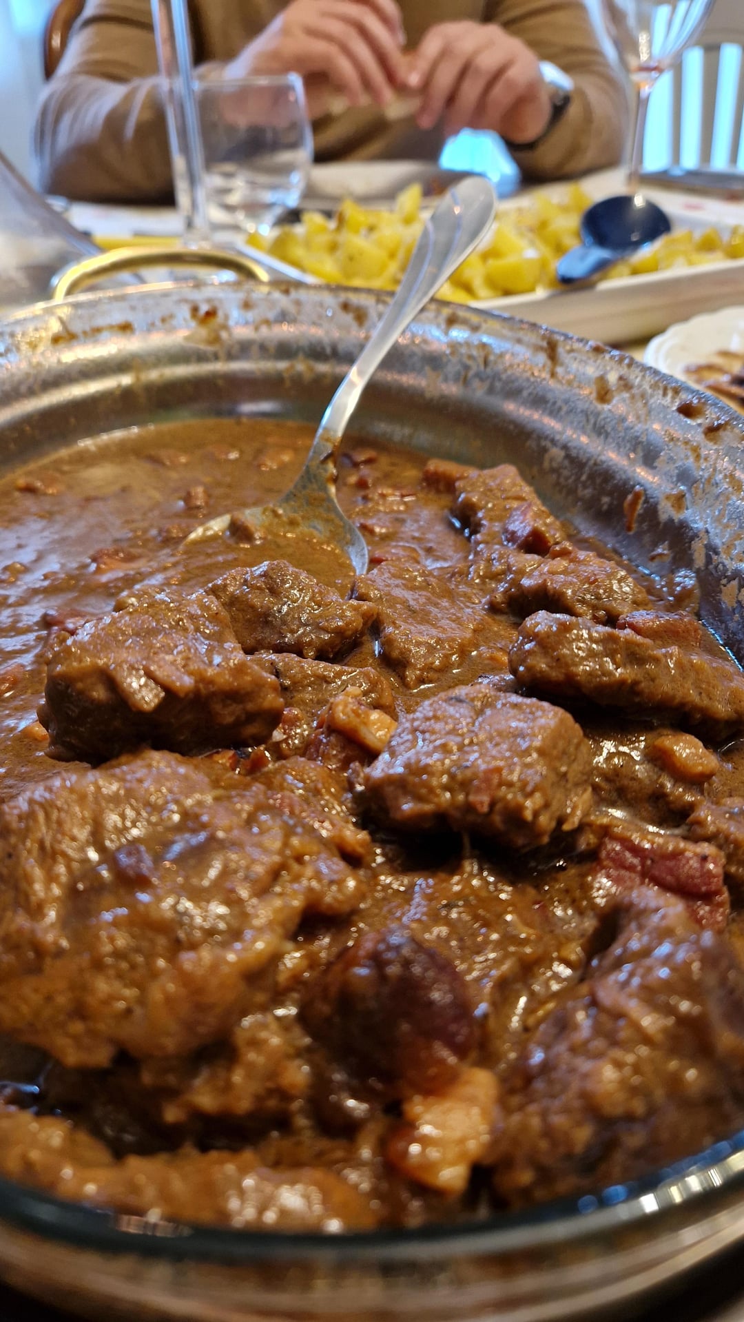 It was also on the Christmas menu here, with Belgian fries and chicory with mayonnaise. The big advantage is that I could prepare the stewed meat a day in advance and just had to put it in the oven for half an hour. The fries and chicory were ready in no time. Everyone went home feeling full and satisfied, and no one had to spend the whole Christmas celebration in the kitchen.