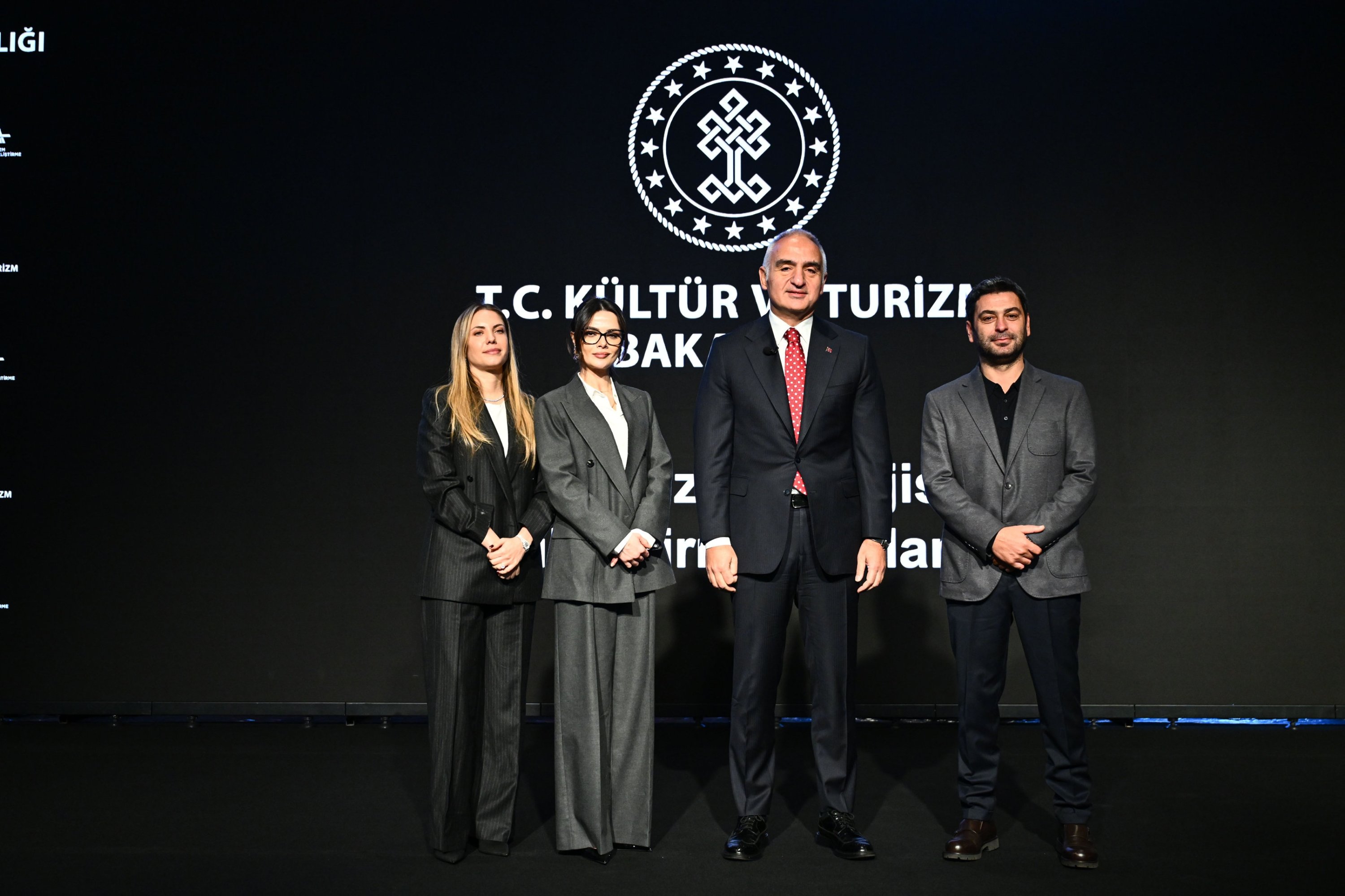 Culture and Tourism Minister Mehmet Nuri Ersoy (C), Eda Eca (L), Sinem Ünsal (2nd L) and Ozan Akbaba pose for a photo at a press conference held at the Atatürk Cultural Center (AKM), Istanbul, Türkiye, Dec. 26, 2025. (AA Photo)